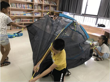 活动邀请到新北区平安防灾减灾服务中心负责人姜临田前来指导。活动共分看图猜猜、情景模拟火灾逃生、帐篷搭建、分享交流4个环节,孩子们划分为2组,看图猜猜环节中,在家长的演示下,让孩子们猜出对应的急救工具,帮助了解用途。火灾逃生环节,姜老师指导家长们连接手臂模拟搭建火灾现场的浓烟弥漫程度,教孩子正确掌握火灾逃生的方法。帐篷搭建环节,2组小朋友互相帮助学习了户外帐篷搭建的技巧,更是突出团队协作的重要性。最后,姜老师引导孩子们互相交流分享了自己认为最重要的家庭急救工具,还给大家普及了一些地震救援知识。