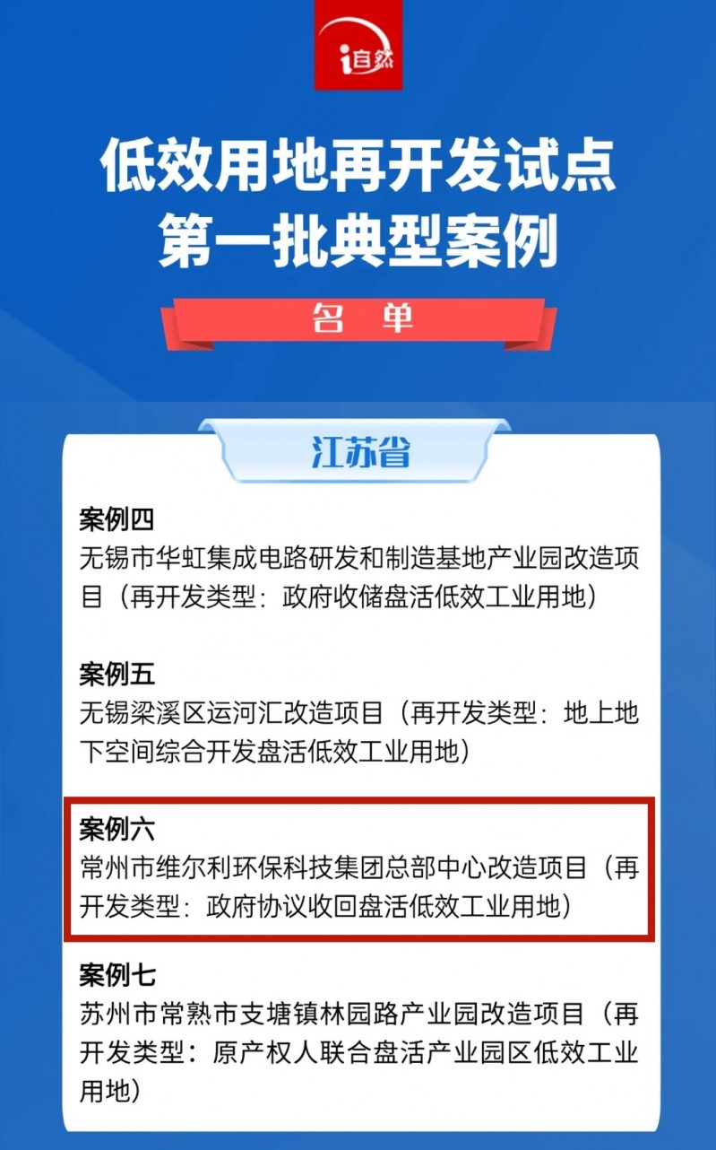 8月23日,自然资源部发布低效用地再开发试点第一批18个典型案例,新北区维尔利环保科技集团总部中心改造项目成功入选,成为全市唯一入选项目!